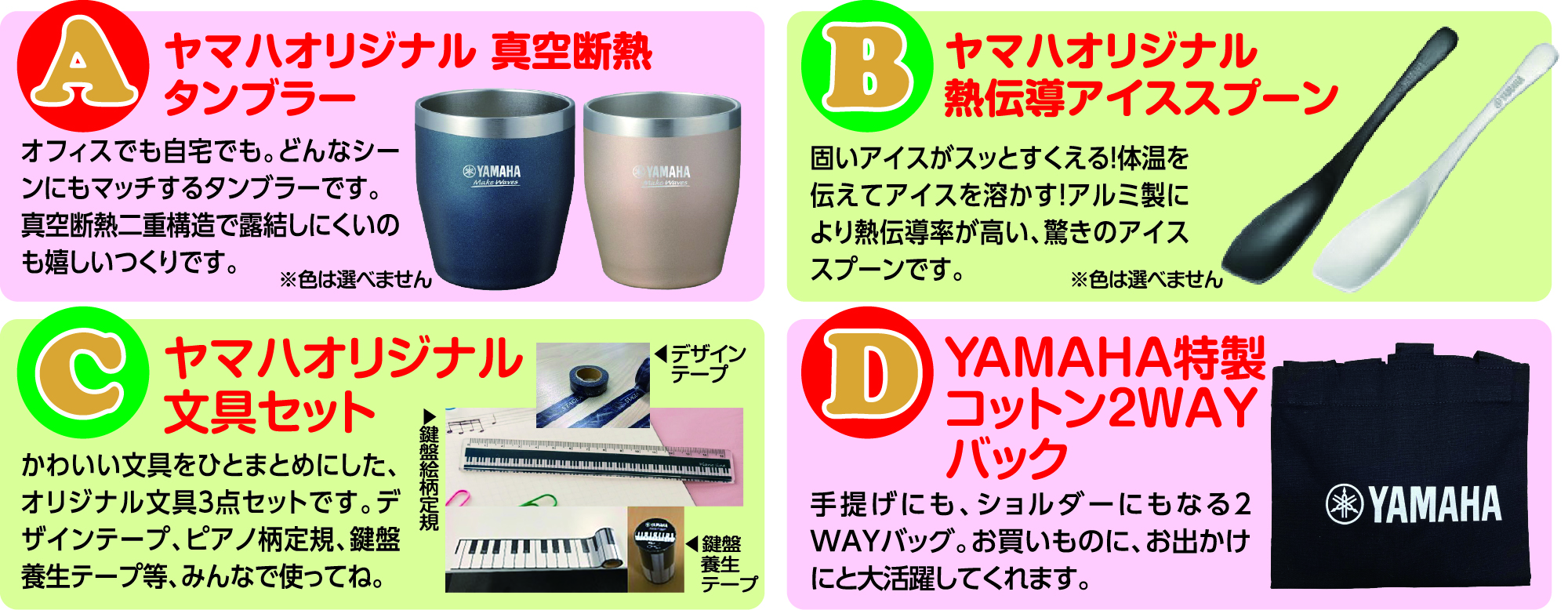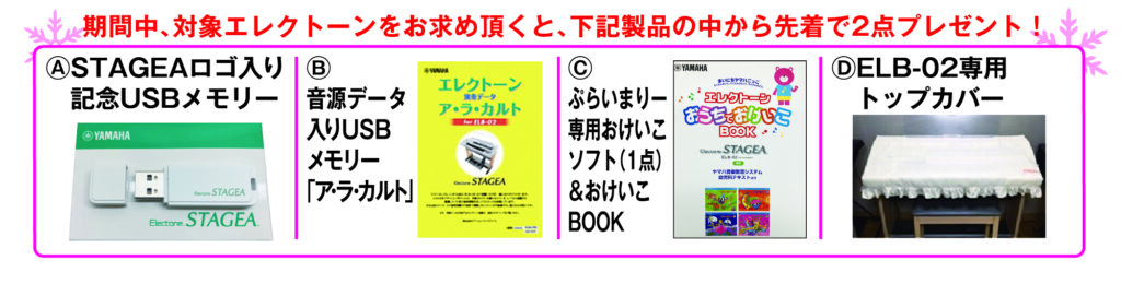 対象商品をお買い求めいただいた方に、下記4点からお好きな商品を1点プレゼントいたします。