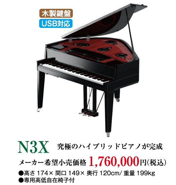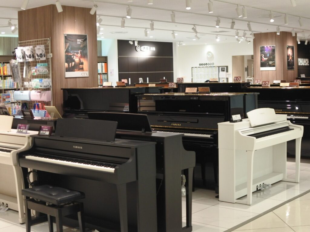初心者向けキーボードをはじめ、電子ピアノ、クラビノーバ、アップライトピアノ、中古ピアノまで、3店舗あわせて100台以上のピアノを取り揃えております。